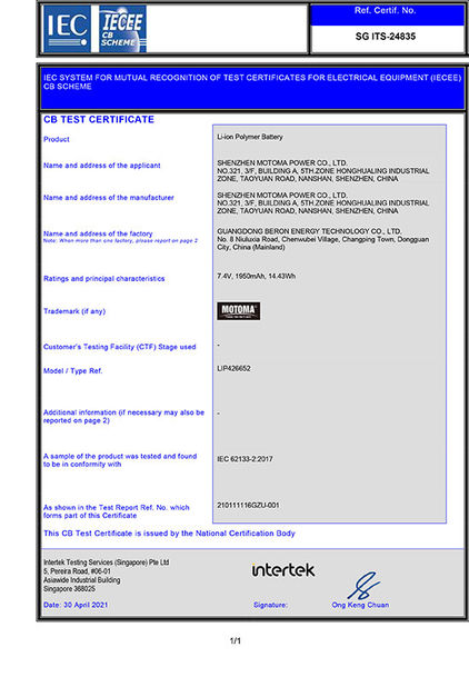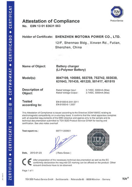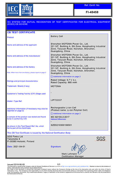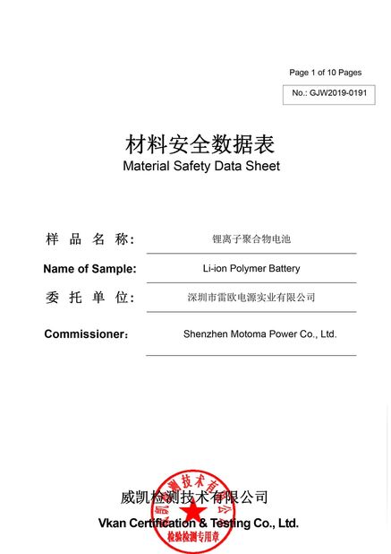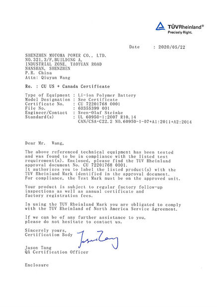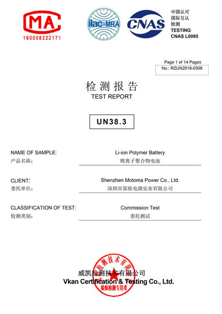 Οι μπαταρίες MOTOMA ισχύουν με τα πιστοποιητικά: ISO9001, ISO14001, ROHS, UL, CE, CB, PSE, KC, IEC62133 BRI, CQC, UN38.3 ΚΑΙ MSDS.
